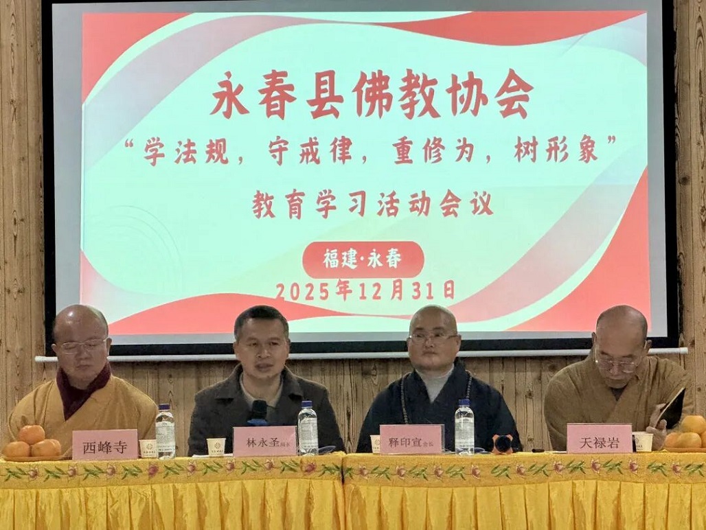 2025 年 12 月 31 日上午,永春县佛教协会 “学法规、守戒律、重修为、树形象” 教育活动动员部署会暨 2025 年第四季度宗教工作会议在天仙寺召开。县民宗局局长林永圣应邀出席并讲话。会议由县佛教协会会长印宣法师主持,协会副秘书长以上人员、理监事及各宗教活动场所负责人参加会议。