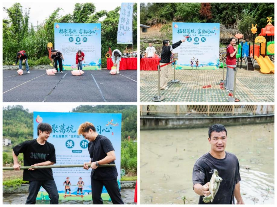 民俗沉浸式体验成为活动最大亮点。在畲乡特色体验区,操杆、赶“猪”跑、板鞋竞速、龙接凤等非遗体育项目轮番上演,游客与村民同台竞技,在协作比拼中感受畲族传统运动的独特魅力。畲语互动区里,畲族歌师现场教学,大家学畲语、唱山歌、跳竹竿舞,在互动参与中领略民族语言与歌舞文化之美。同心田内,撒莲子、系福带、“灵鼋擒珍”抓甲鱼等农事体验项目人气高涨,游客们亲近自然、乐享田园野趣。